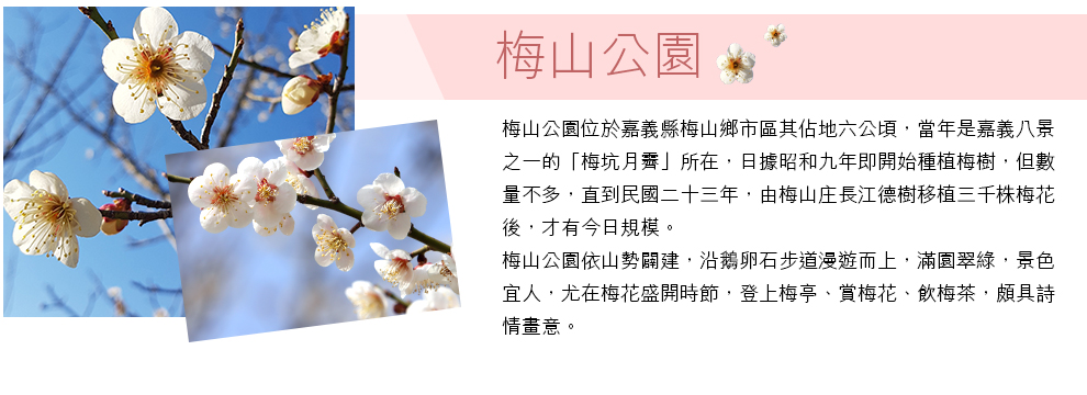 梅山公園位於嘉義縣梅山鄉市區其佔地六公頃,當年是嘉義八景之一的「梅坑月霽」所在,日據昭和九年即開始種植梅樹,但數量不多,直到民國二十三年,由梅山庄長江德樹移植三千株梅花後,才有今日規模。