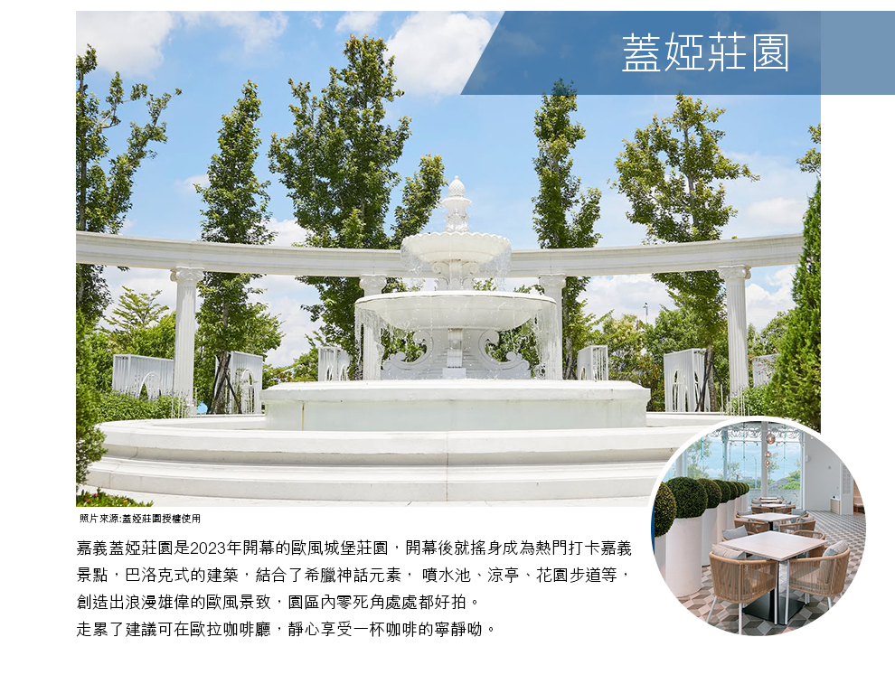 嘉義蓋婭莊園是2023年開幕的歐風城堡莊園,開幕後就搖身成為熱門打卡嘉義景點,巴洛克式的建築,結合了希臘神話元素, 噴水池、涼亭、花園步道等,創造出浪漫雄偉的歐風景致,園區內零死角處處都好拍。走累了建議可在歐拉咖啡廳,靜心享受一杯咖啡的寧靜呦。