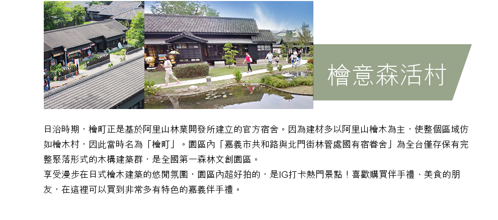 享受漫步在日式檜木建築的悠閒氛圍,園區內超好拍的,是IG打卡熱門景點!喜歡購買伴手禮、美食的朋友,在這裡可以買到非常多有特色的嘉義伴手禮。