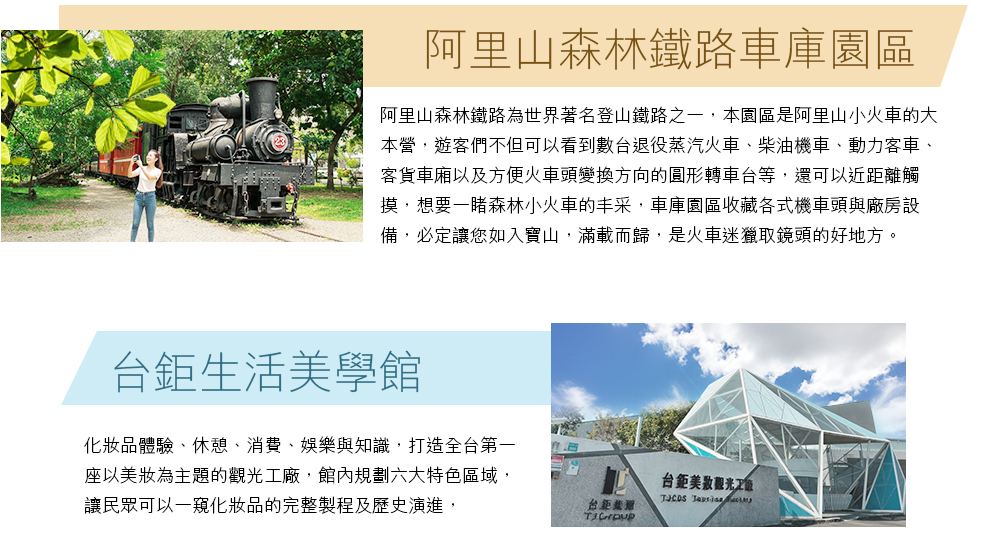 阿里山森林鐵路為世界著名登山鐵路之一,本園區是阿里山小火車的大本營,遊客們不但可以看到數台退役蒸汽火車、柴油機車、動力客車、客貨車廂以及方便火車頭變換方向的圓形轉車台等,還可以近距離觸摸,想要一睹森林小火車的丰采,車庫園區收藏各式機車頭與廠房設備,必定讓您如入寶山,滿載而歸,是火車迷獵取鏡頭的好地方。