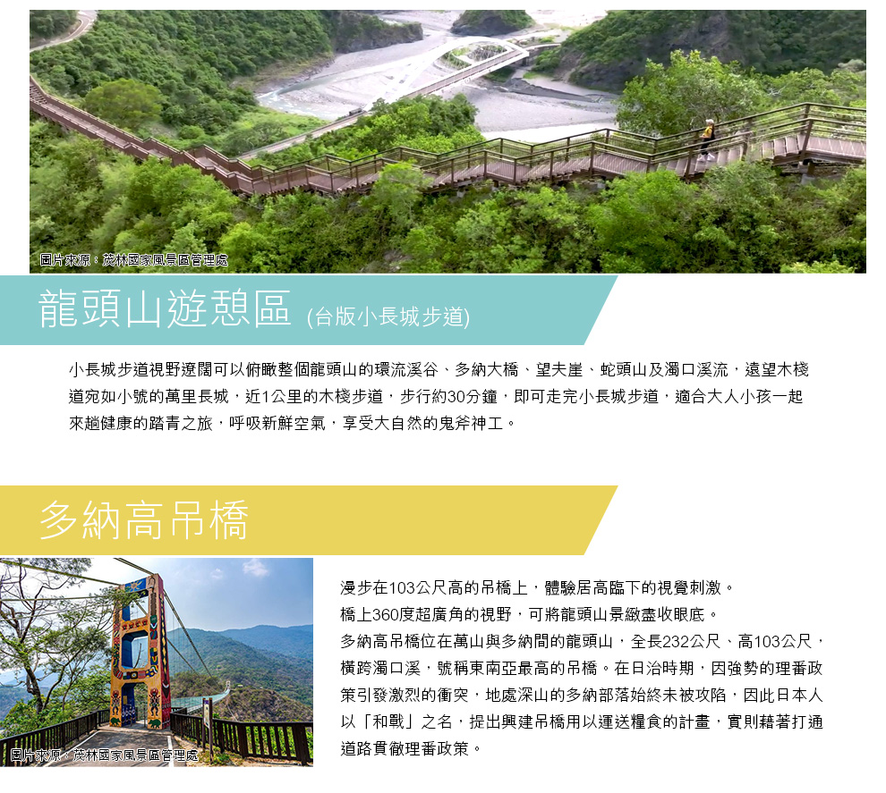 小長城步道視野遼闊可以俯瞰整個龍頭山的環流溪谷、多納大橋、望夫崖、蛇頭山及濁口溪流,遠望木棧道宛如小號的萬里長城,近1公里的木棧步道,步行約30分鐘,即可走完小長城步道,適合大人小孩一起來趟健康的踏青之旅,呼吸新鮮空氣,享受大自然的鬼斧神工。