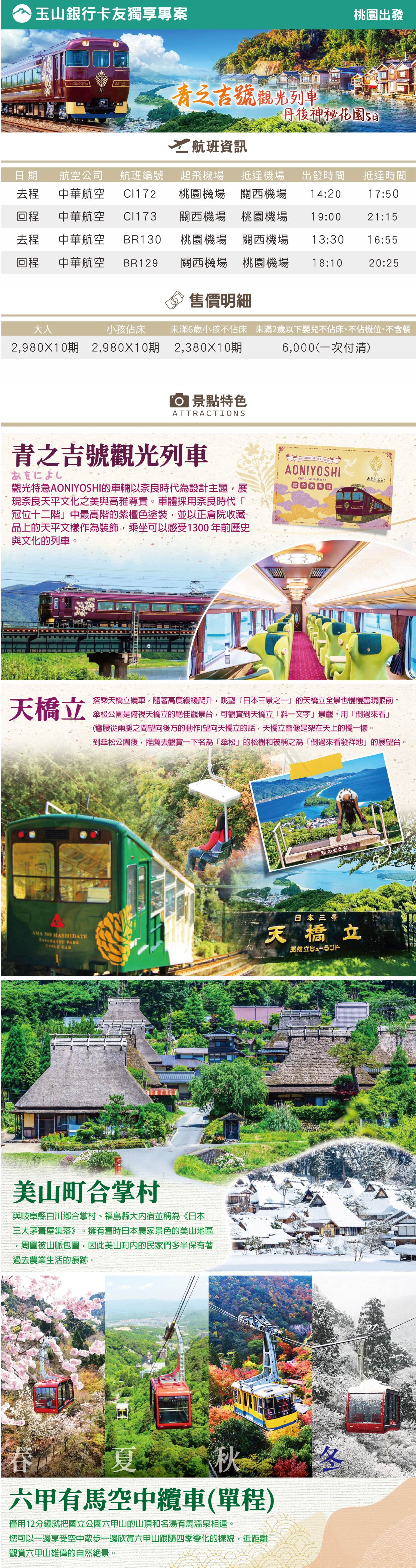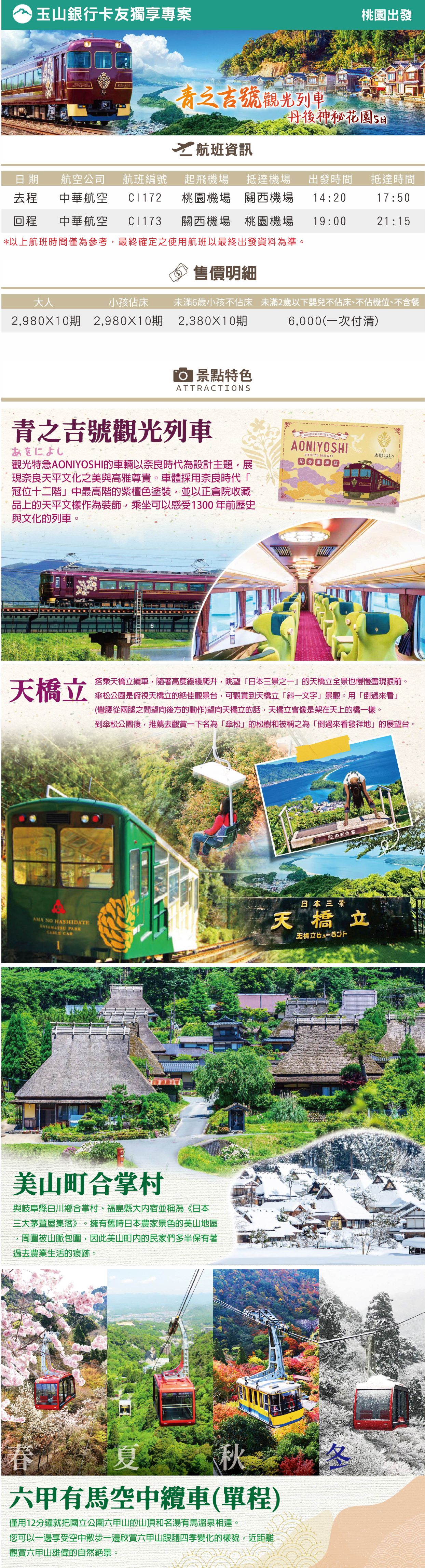 3.行程及餐食將會視情況(如季節、預約狀況、觀光地區休假及住宿飯店地點)調整。