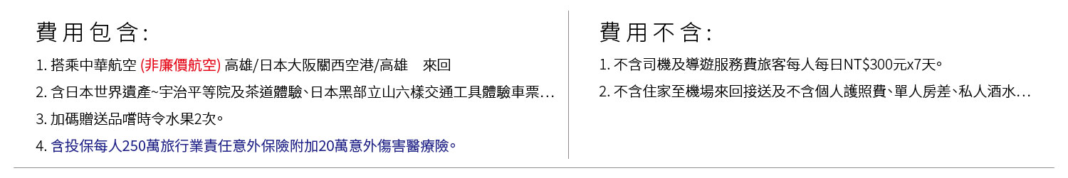 5.為顧及旅客人身安全與相關問題,在日本旅遊行程期間恕無法接受脫隊要求。