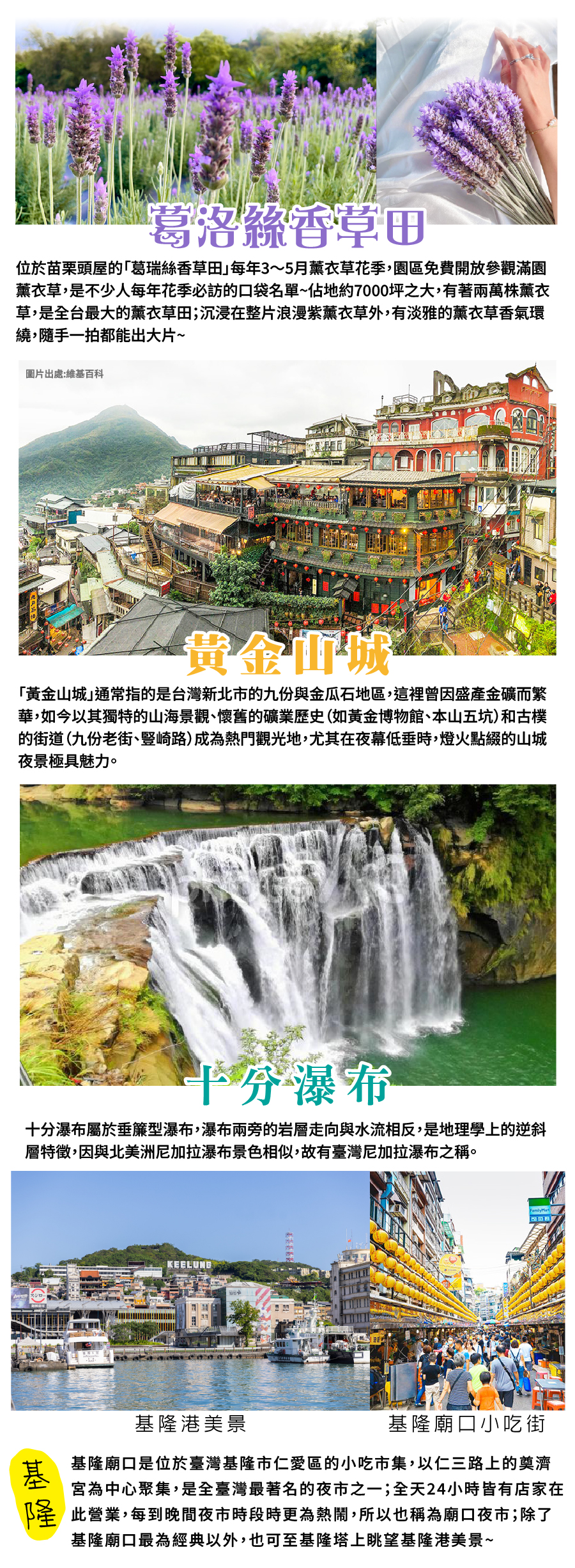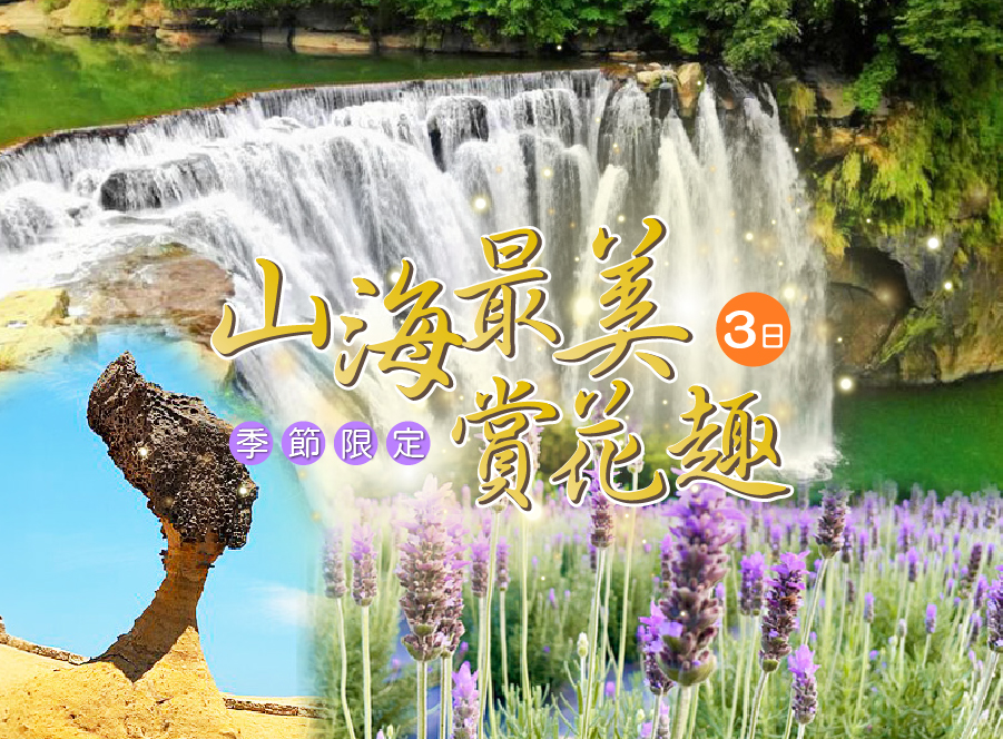 高雄07:00出發 ➜台版普羅旺斯「葛瑞絲香草田」台灣最大的薰衣草田 ➜有「黃金山城」美稱九份(午餐敬請自理) ➜台灣尼加拉瀑布美稱十份瀑布(水流如白色綢緞般傾瀉而下,氣勢磅礡) ➜基隆塔 ➜基隆廟口小吃街 (晚餐敬請自理)➜金山海灣溫泉大飯店體驗泡湯樂趣