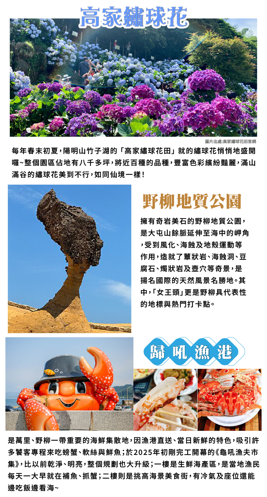 集合出發 ➜季節限定浪漫繡球花高家繡球花萬里園區賞花趣 ➜野柳質地公園 ➜歸吼漁港(午餐敬請自理) ➜林口三井奧特萊絲MITSUI OUTLET PARK ➜林口爵怡溫德姆大酒店